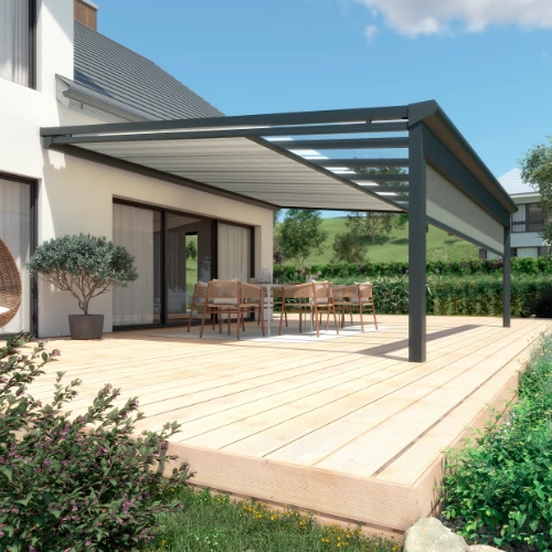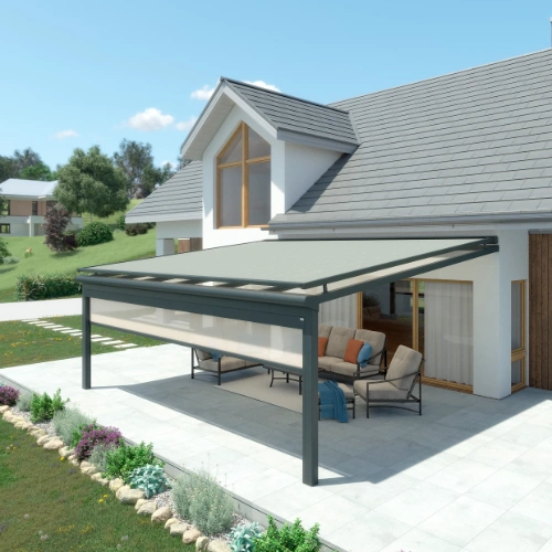 Durch das schlanke Design und die hochwertige Verarbeitung fügen sich die Markisen dezent in jede Konstruktion ein. Das Tuch fährt leise und präzise über Führungsschienen aus, während der elektrische Antrieb für höchsten Bedienkomfort sorgt.